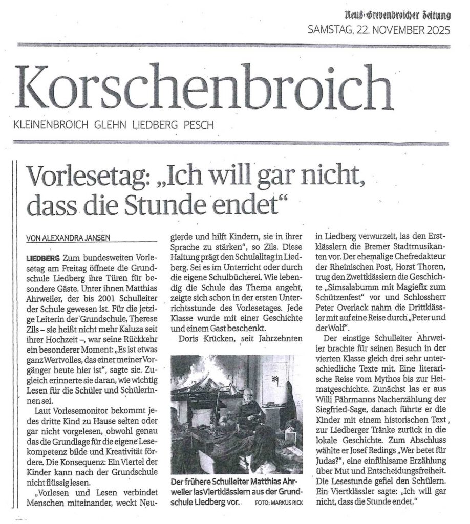 Für unsere Schulgemeinschaft war der Besuch von Matthias Ahrweiler, Schulleiter der GGS Liedberg bis 2001, ein bewegender Moment. Unsere heutige Schulleiterin Therese Zils begrüßte ihn mit großer Wertschätzung und betonte, wie bedeutsam es sei, dass einer ihrer Vorgänger den Weg zurück in unsere Schule gefunden hat. Zugleich unterstrich sie, wie wichtig das Vorlesen für die Sprachentwicklung, Kreativität und Lesekompetenz der Kinder ist.